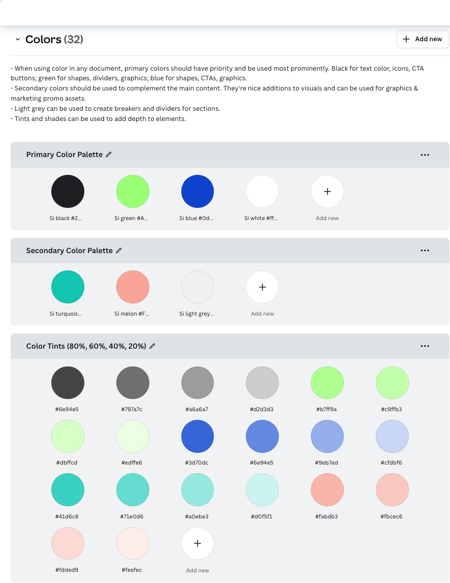 Here’s an example of a color guide from our brand guidelines. Notice how we include specific hex codes along with detailed instructions.