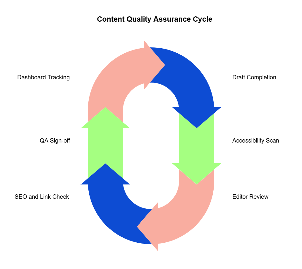 Roles need to be clear. Writers own accuracy and source attribution. Editors control tone and clarity, while accessibility experts and SEO leads spot technical issues in their domains. Assigning named responsibility at each stage turns “quality control” from a vague goal into a daily habit.