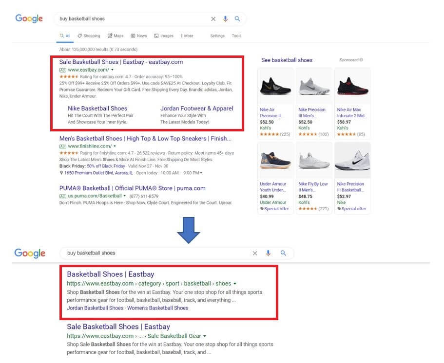 Consider Eastbay, a sports apparel retailer. When you search “buy basketball shoes,” they show up as the first paid result, as well as the second (and third) organic result.