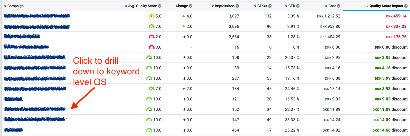 From here, you can click into a campaign to see your Quality Score on a keyword level, including cost penalties or discounts: