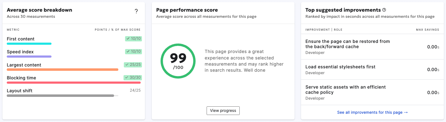 - Get a Performance Overview. Siteimprove scores your page performance across different metrics including first content, blocking time, and layout shift. Then it provides a prioritized list of suggested improvements.