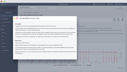 Put simply, accessibility software makes it easier to tackle issues without being an accessibility expert. They’ll turn accessibility standards into actionable to-dos, and some platforms like Siteimprove will provide explanations of issues, advice on how to resolve them, and references to official WCAG techniques.