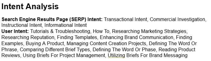 Your team shouldn’t need to reverse-engineer the SERP. In a great brief, you highlight what competitors cover and what they skip. Example: “Top 3 pages all list out steps, but none provide a single downloadable template or case study.”