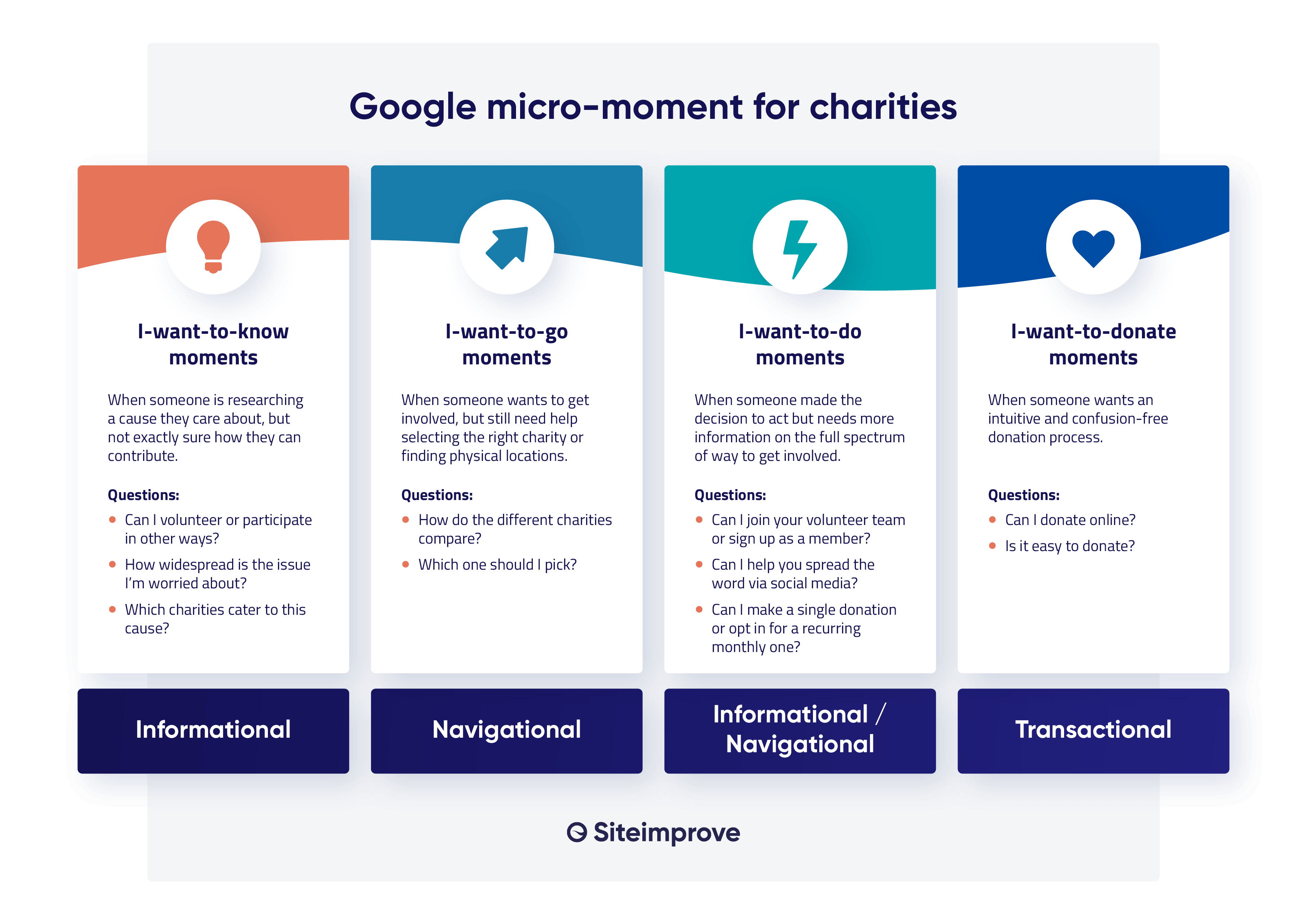 You must understand the underlying search intent of your website’s visitors. Are they looking to make a donation now or are they trying to learn more about your cause?