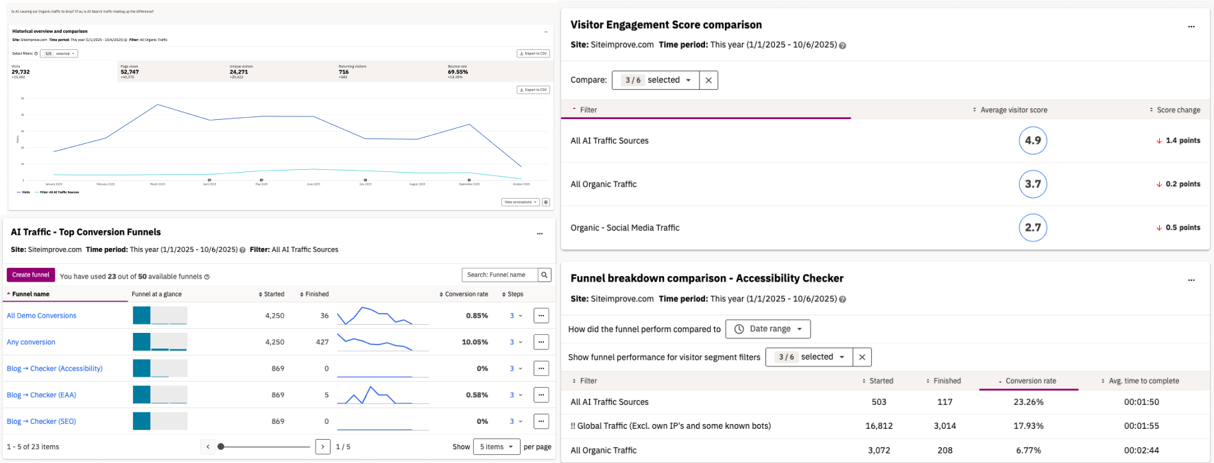 - Is the LLM cohort engaged and present in the journey? The visitor engagement score comparison indicates whether that cohort passes a quality bar. AI Traffic — Top Conversion Funnels reveals assisted behavior (present upstream, not last click).