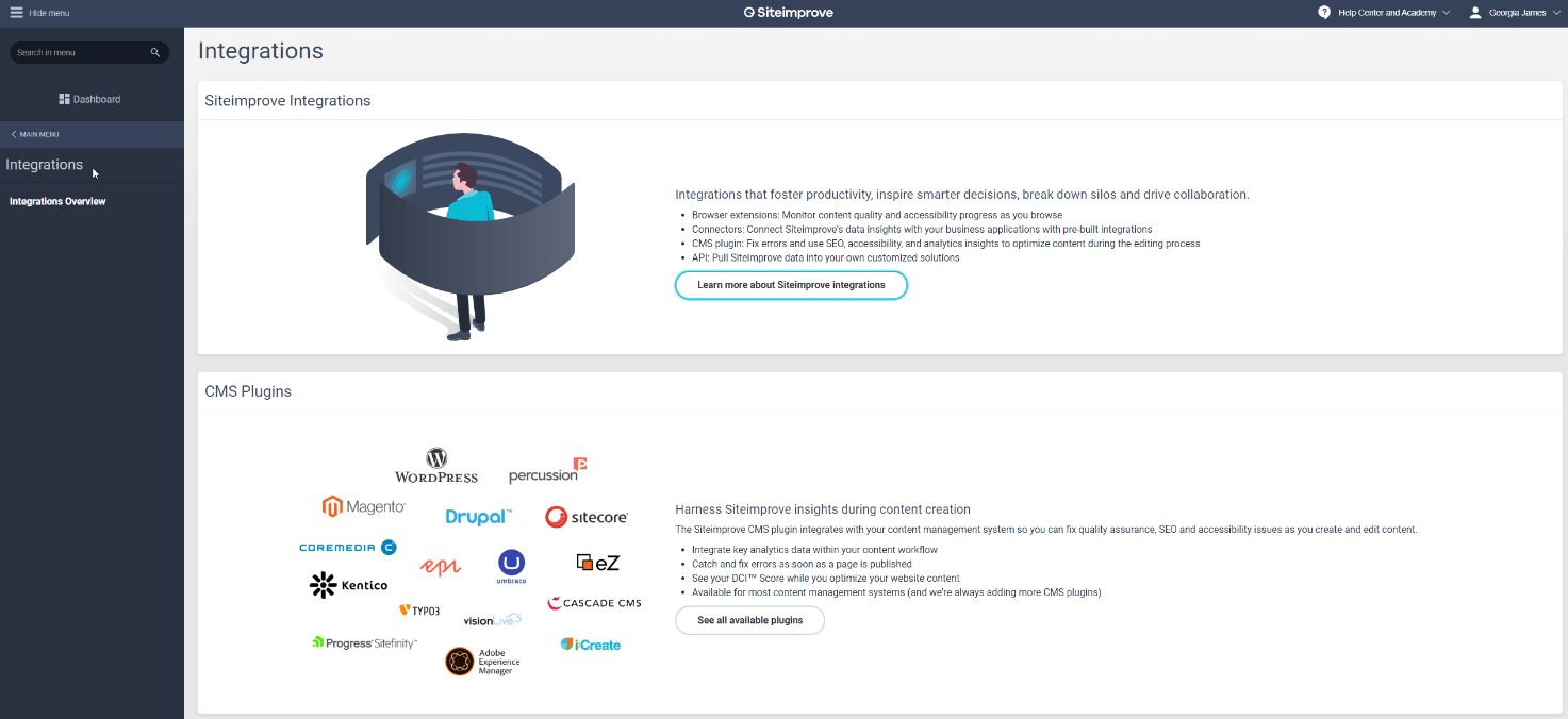 So, where are they? All our integrations are easily accessed by clicking on Integrations > Integrations Overview, in the main menu within the Siteimprove platform.