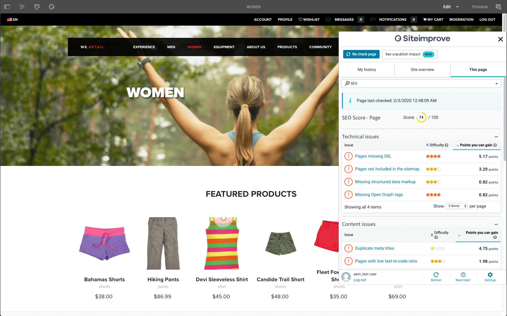 Catching content issues before publication is always better than having them pointed out once they’re live for everyone to see. The Adobe Experience Manager integration has the added advantage of Siteimprove’s Prepublish check functionality, to make sure your content complies with quality standards and policies before you hit publish.