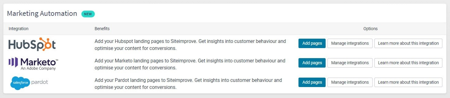 Why manage scattered landing page content across different systems when you can do it all from one place? Our marketing automation integrations enable you to add marketing landing pages to your Siteimprove account so you can effortlessly monitor your pages for performance and brand compliance, glean valuable insights on customer behavior, and optimize your content for conversions.