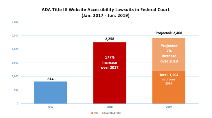 The U.S. has experienced an increasing amount of web accessibility lawsuits filed in federal and state courts, from 814 lawsuits in 2017 to at least 1,204 lawsuits in 2019.