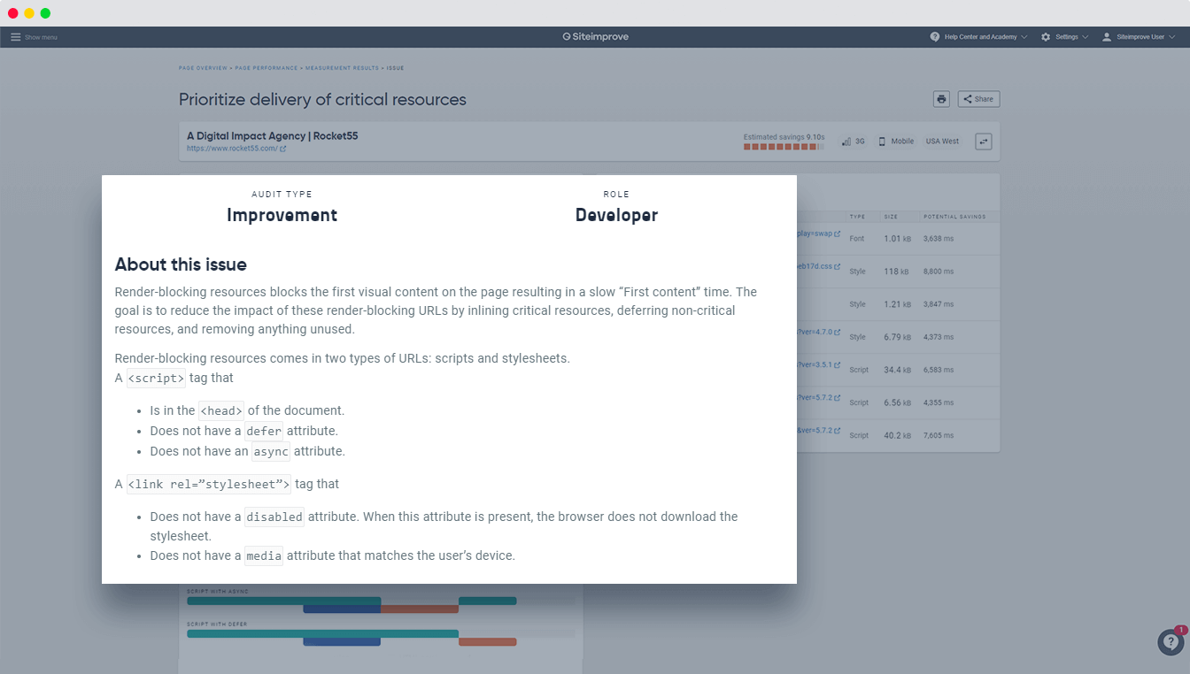 Verschaffen Sie sich einen Überblick über die Probleme auf einer Seite und erhalten Sie verständliche Erklärungen dazu, worin die Probleme bestehen, wie man sie beheben kann und wer das nötige Fachwissen dazu besitzt. Eine Liste mit Verbesserungsvorschlägen hilft Ihnen dabei, Probleme nach ihrem Einfluss auf Ihre Ladezeiten zu priorisieren. Da Website-Performance oft eine Teamleistung ist, können Sie alle Erklärungen zu Problemen einfach mit anderen Teams oder externen Agenturen teilen.