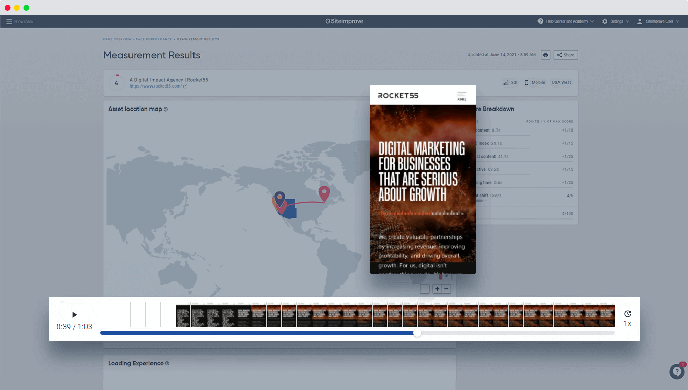 Nicht alle Performance-Probleme wirken sich gleichermaßen auf die Seitengeschwindigkeit aus. Sowohl die Anzahl von Elementen als auch die geographische Nähe Ihrer Besucher zu Ihrem Webserver spielen für Ihre Seitenladezeiten eine entscheidende Rolle. Mit Wiedergabevideos der Sessions sehen Sie, wie schnell unterschiedliche Elemente einer Seite für Ihre Nutzer geladen werden. Anhand einer Standortkarte der Seitenelemente können Sie erkennen, wo sich die einzelnen Elemente befinden, und sie auf Server in der Nähe Ihrer Besucher verlagern, damit sie schneller geladen werden.