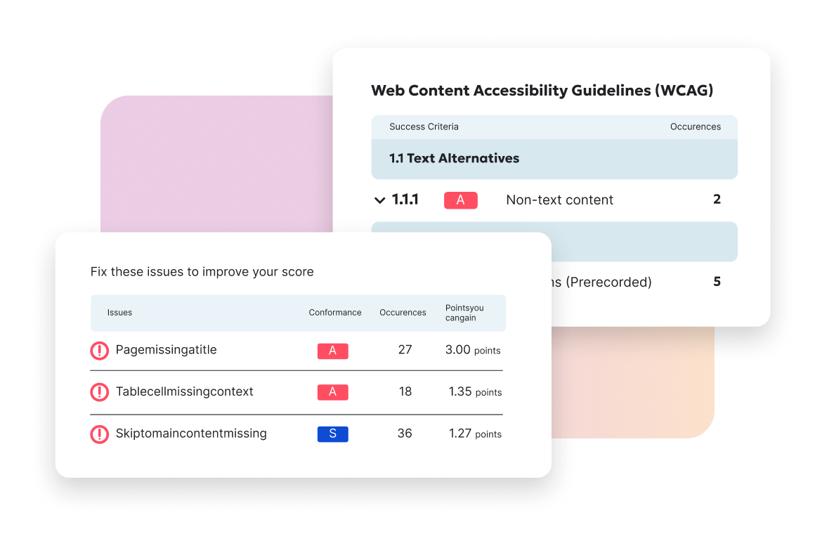 Siteimprove automates the process of meeting accessibility standards like WCAG, ADA, and Section 508 through checks for things like color contrast and alt text, and this is complemented by expert manual testing.