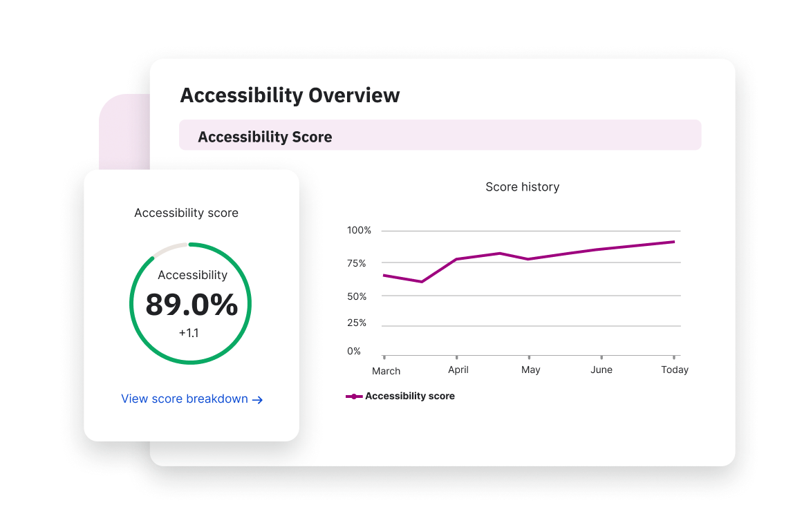 Demonstrate the value of your efforts to leadership with a customized Accessibility Score that provides a clear, measurable view of your progress over time. Plus, see all of your Manual Testing reports in the same platform.