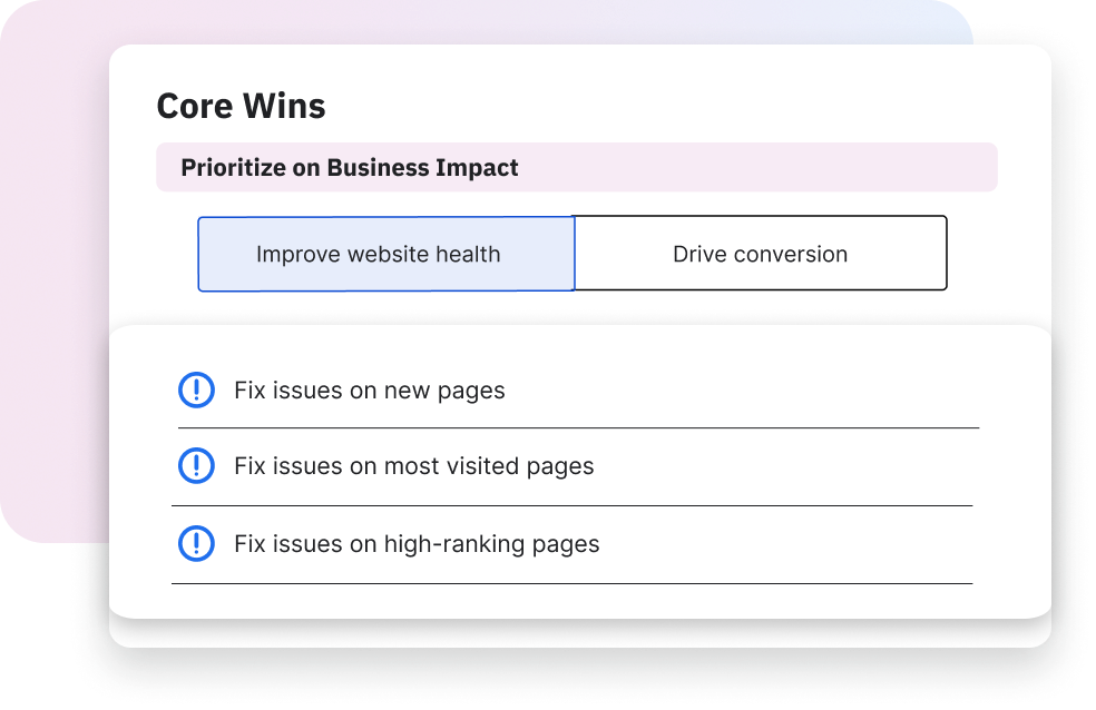 Go beyond just finding errors by getting a prioritized list of fixes, sorted by WCAG standard and severity, so your team can focus their efforts on what matters most.