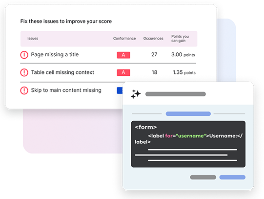 With the Siteimprove Accessibility Code Checker, you’ll receive instant accessibility assessments and AI-powered remediation suggestions for your website’s code.