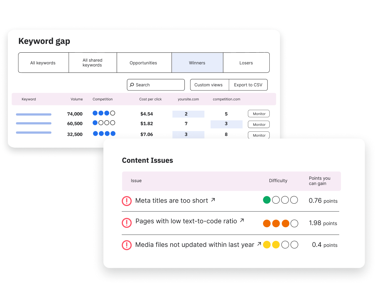Go beyond basic rank tracking. Our platform provides the deep competitive intelligence and performance data you need to uncover hidden opportunities, report on the impact of your SEO efforts, and protect your organic traffic.