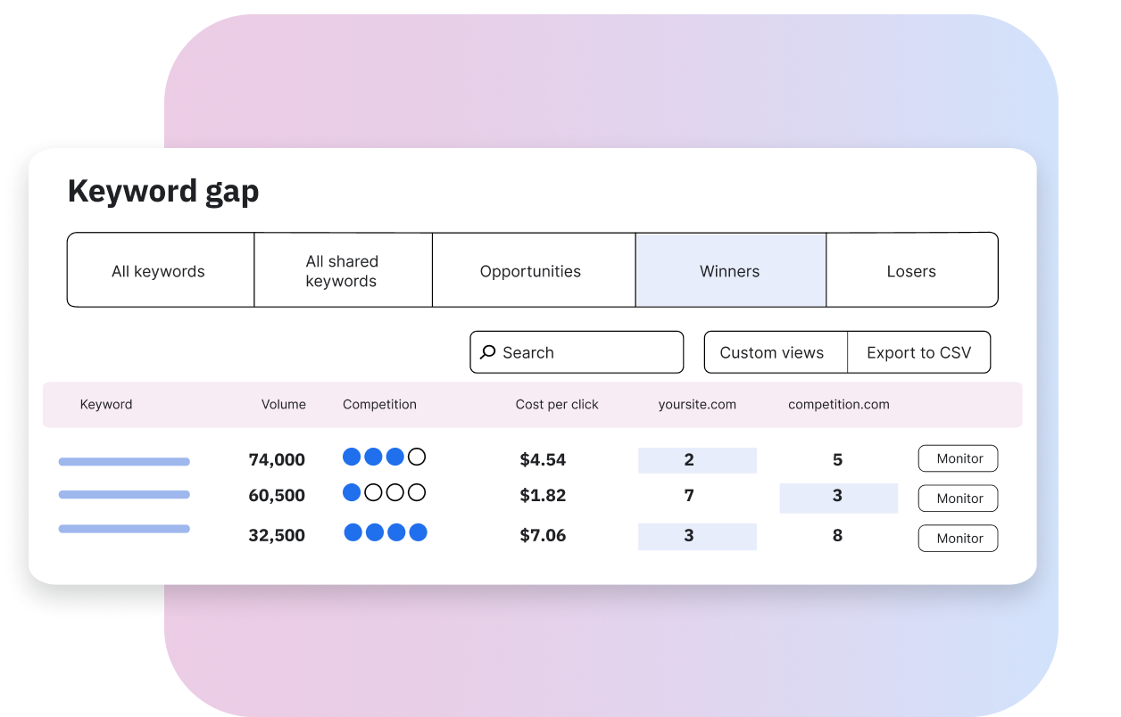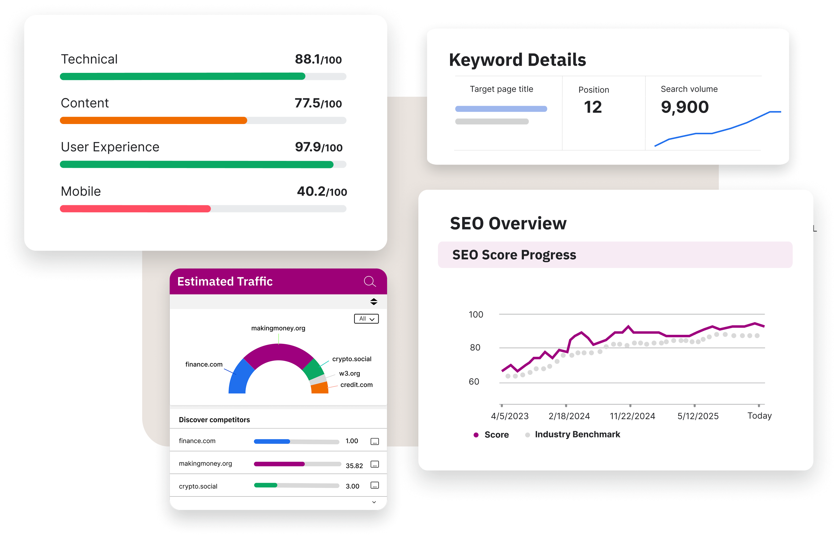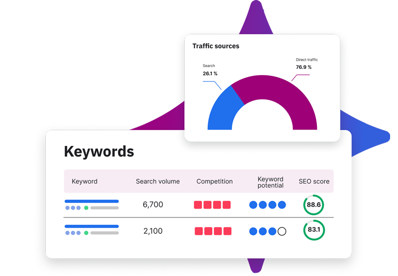 Benchmark your SEO performance, uncover competitive gaps, and map new keyword opportunities. Use AI suggestions to craft content that fills gaps, ranks higher, and pulls in more qualified traffic—faster.